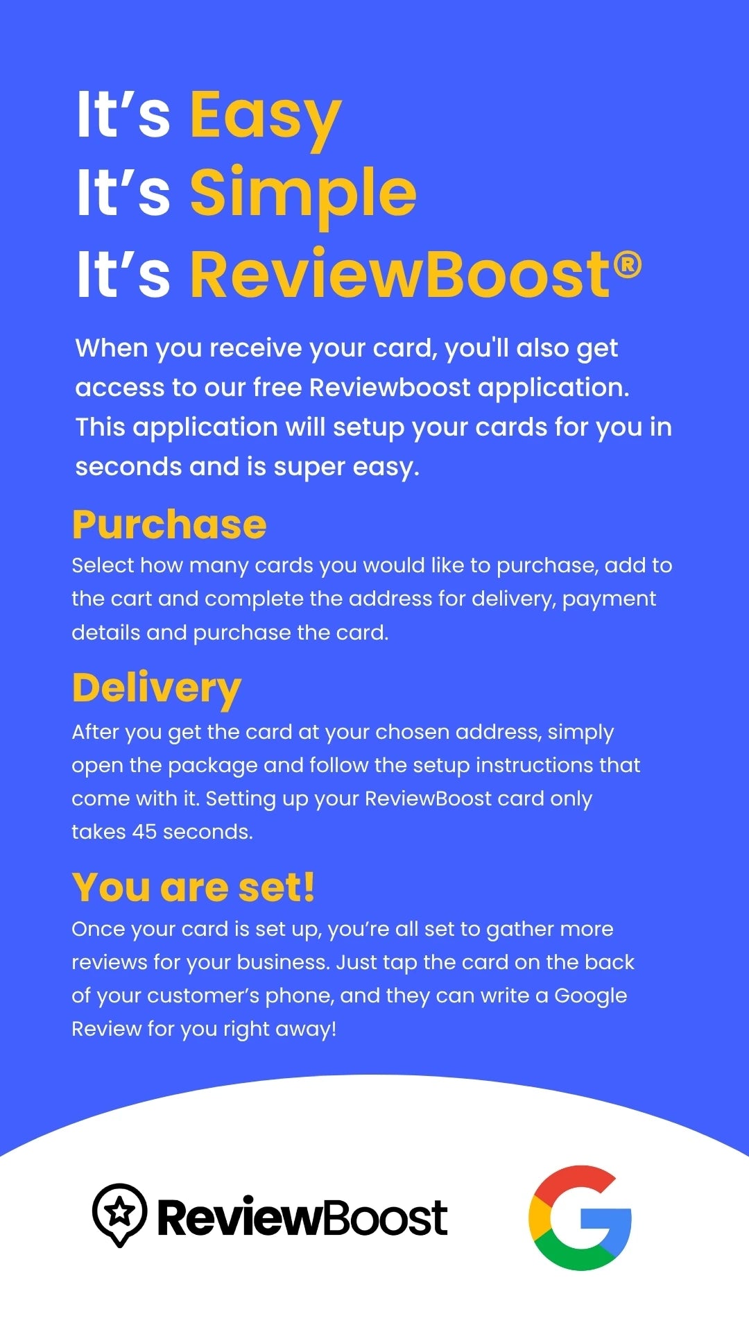 Not satisfied with your ReviewBoost® Card? Send it back to us and we'll refund your order in full!